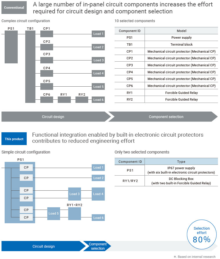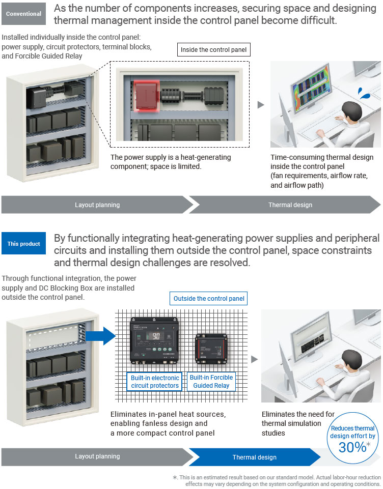 [Design] Solves in-panel space and heat issues. Functional integration reduces the engineering effort required for designing and selecting external circuits