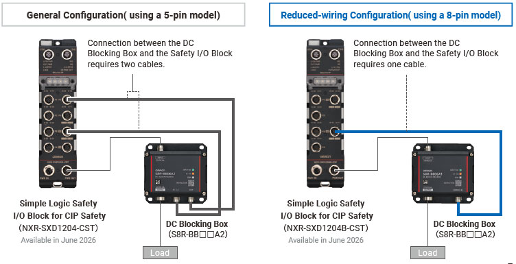 Safety circuits can be easily installed outside the control panel using an IP67-rated DC Blocking Box with a built-in Forcible Guided Relay. With the reduced-wiring configuration(using a 8ーpin model), the DC Blocking Box and the Safety I/O Block can be connected using a single signal cable, significantly reducing wiring work and installation time.