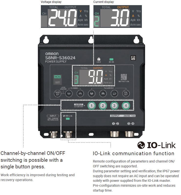 The IP67 power supply adopts a connector-based connection method designed with a focus on water and dust resistance as well as ease of wiring, and features a highly visible digital display that allows users to check voltage and current status at a glance without using a tester.